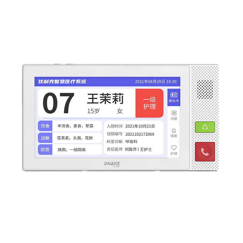 安裝在病床頭的交互設(shè)備機(jī),代替?zhèn)鹘y(tǒng)紙質(zhì)卡。產(chǎn)品支持呼叫對(duì)講、為住院患者提供病例查詢(xún)、狀態(tài)自動(dòng)提醒等護(hù)理需求等。