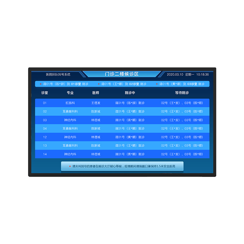 1)掛號大廳部署LED拼接電視墻,進(jìn)行屏幕劃分,分別顯示各科室目前有多少人排隊(duì),預(yù)計(jì)完成時間,掛號的多重病患的病人可以根據(jù)屏幕提示自主選擇看病次序。
