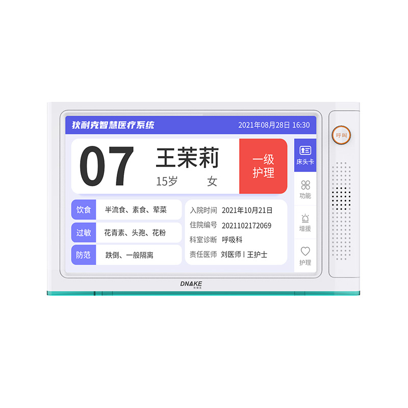 安裝在病床頭的交互設備機,代替?zhèn)鹘y(tǒng)紙質卡。產(chǎn)品支持呼叫對講、為住院患者提供病例查詢、狀態(tài)自動提醒等護理需求等。