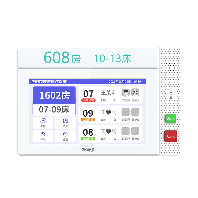 設置在病房門口的終端設備,主要用于顯示病房相關信息,內置簡易醫(yī)護工作站,支持病房床位一覽、患者動態(tài)跟蹤、呼叫對講、增援求救等多種呼叫類型,信息齊全,及時響應醫(yī)護需求,實現(xiàn)智能化醫(yī)護管理。