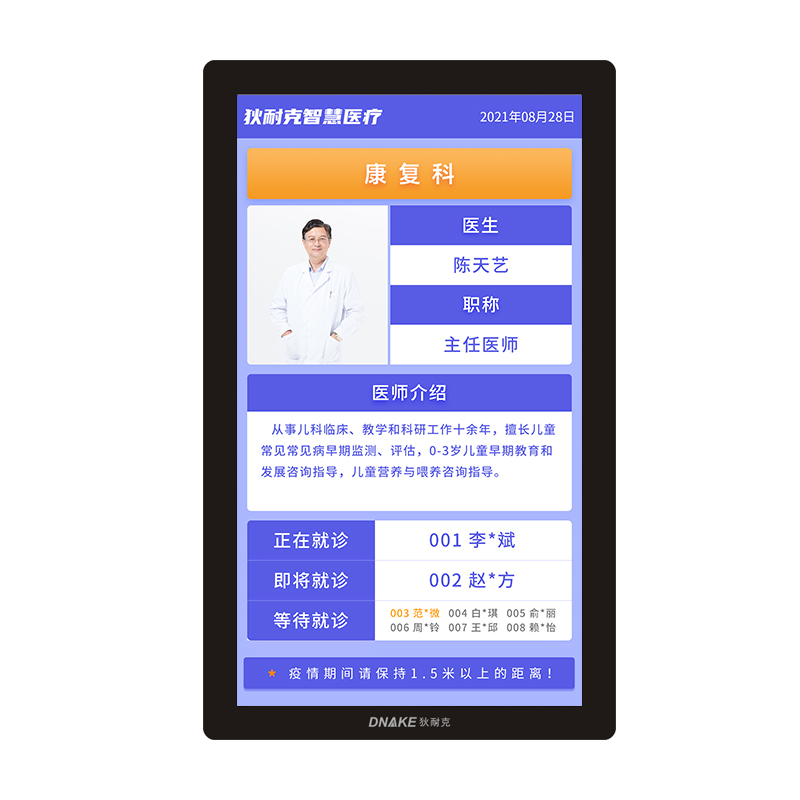 1)可顯示診室醫(yī)生姓名、職稱、照片以及診室號(hào)、當(dāng)前呼叫病人姓名與號(hào)碼、當(dāng)前等待就診病人姓名與號(hào)碼;
